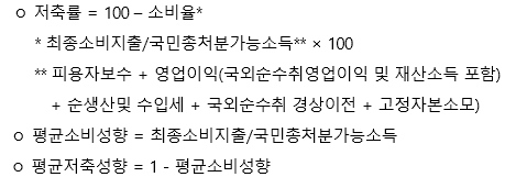 국민총처분가능소득중 소비되지 않고 남는 부분을 총저축 혹은 국민 저축이라 하는데, 저축률은 100에서 국민총처분가능소득중 최종소비를 목적으로 처분된 재화와 서비스의 비율인 소비율을 차감한 것이다. 이때 소비율을 백분율이 아닌 계수로 표시한 것을 평균소비성향이라 하며, 평균저축성향은 1에서 평균소비성향을 차감한 것이다.