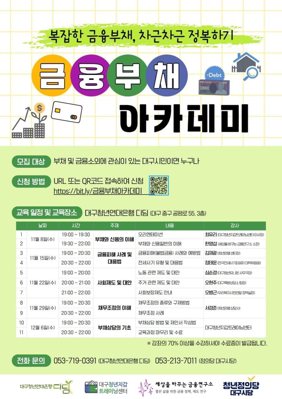 [금융부채 아카데미] ' 복잡한 금융부채 차근차근 정복하기' 금리인상, 불법금융, 전세 사기 등으로 청년, 서민층의 경제 상황이 어려워지고 부채 문제가 심각해지고 있습니다. 이번 금융부채 아카데미 '복잡한 금융부채 차근차근 정복하기' 를 통해 이러한 복잡하고 다양해지는 금융부채를 배워보고 부채와 금융소외 문제에 대해 이해해보려고 합니다. 이를 해결하기 위한 정책과 제도를 배우고 금융 소외 없는 안전망을 만들기 위한 금융부채 아카데미를 진행합니다. 부채, 신용에 대한 이해 금융피해 채무조정, 사회보장제도 상담까지 다양한 기관의 강사들과 구체적이고 알찬 내용으로 준비했으니 많은 참여 부탁드립니다! [신청링크] bit.ly/금융부채아카데미 [행사 개요] 1) 일시 : 2023년 11월 8일~12월 6일(수) ..